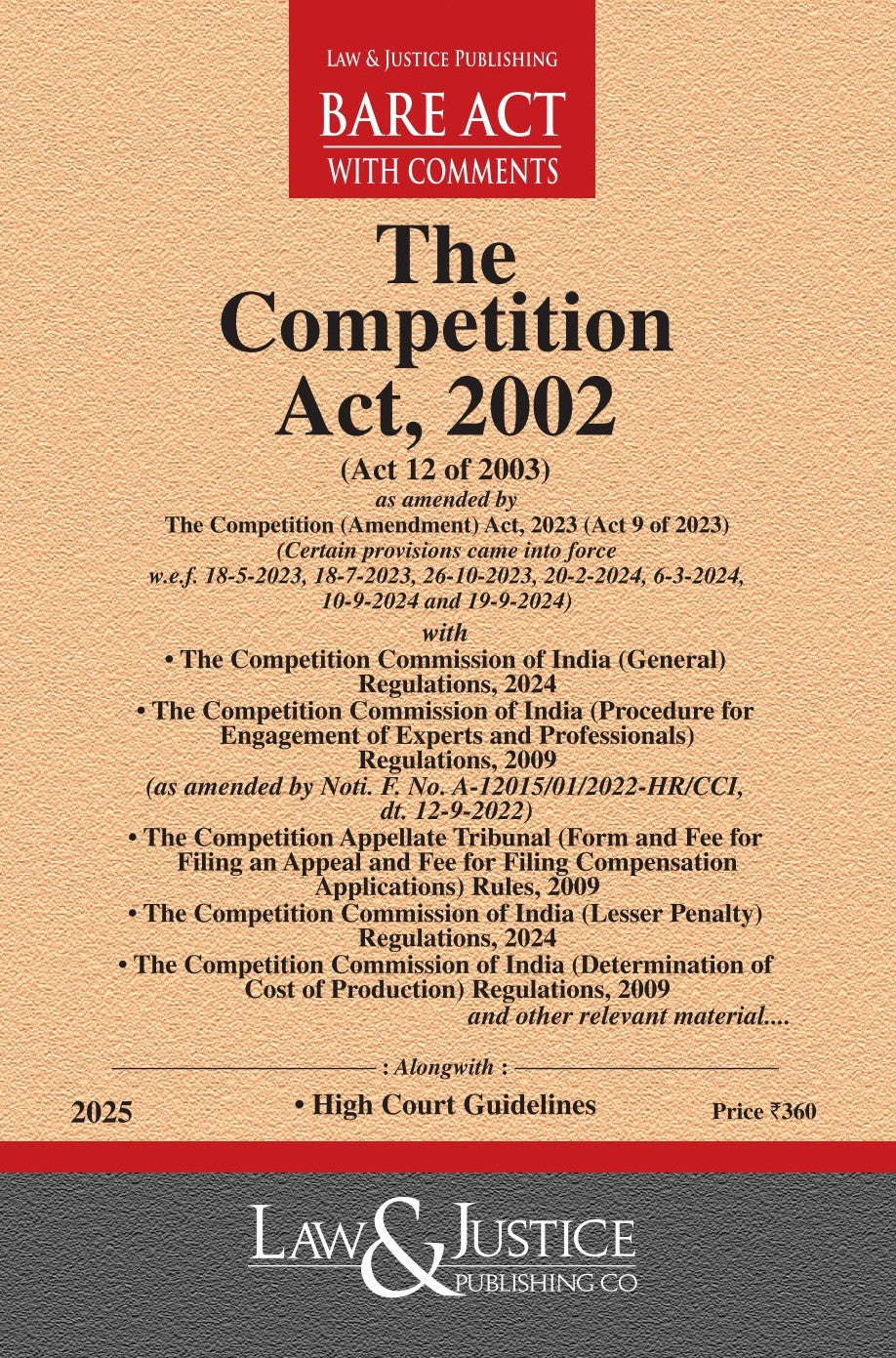 The Competition Act, 2002 is India’s principal legislation governing anti-competitive practices, abuse of dominant position, regulation of combinations, and promotion of fair competition in markets. This 2025 updated edition, published by Law & Justice Publishing Co., presents the Bare Act with comments, incorporating all amendments brought by the Competition (Amendment) Act, 2023, with provisions enforced in a phased manner up to 19 September 2024.